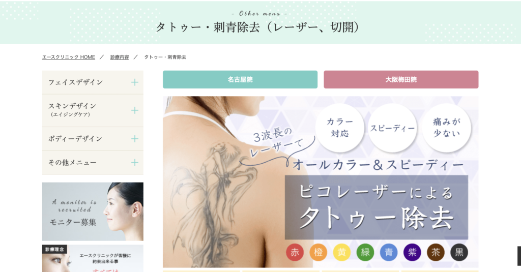 – エースクリニック名古屋院のタトゥー除去の特徴 –